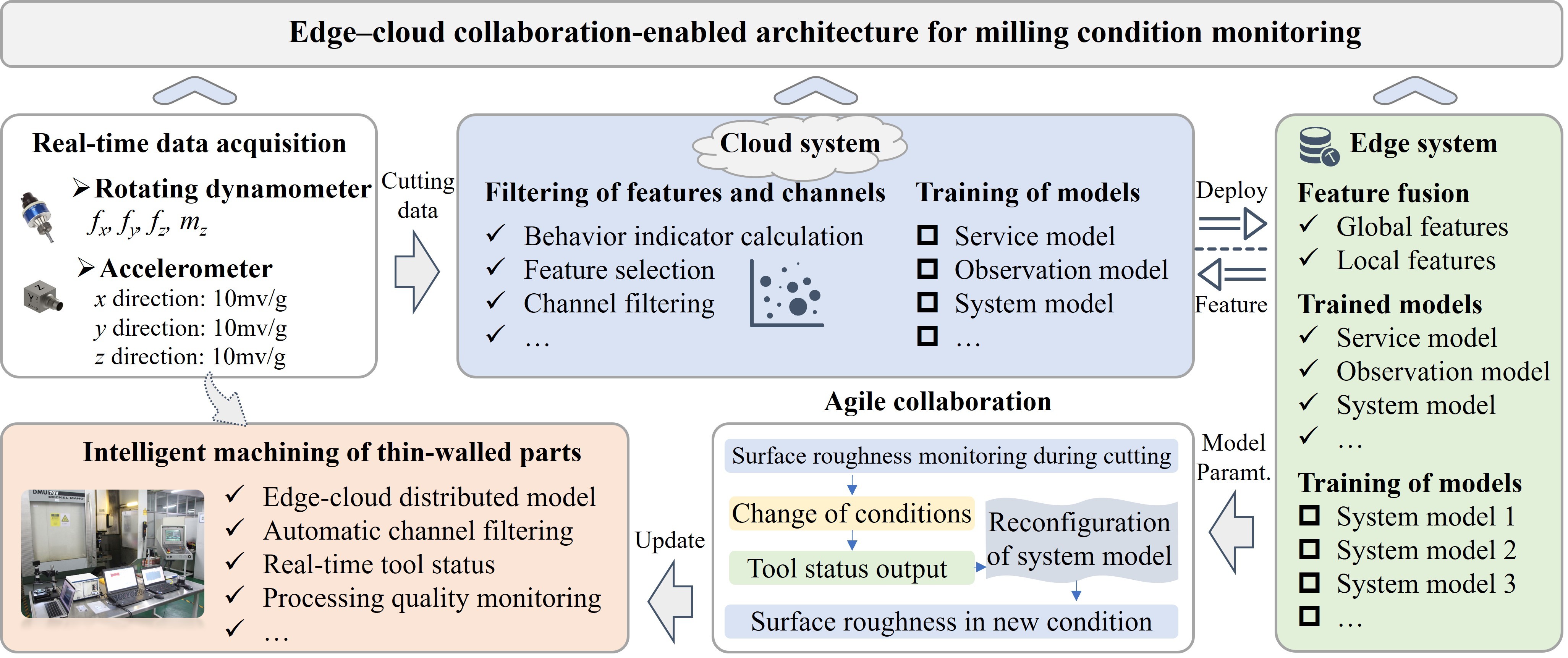 为了实现对难加工类薄壁件加工质量的精确识别,通过构建边-云协同使能的分布式模型,将刀具磨损状态信息融合到了表面粗糙度监测中,并通过对分布式模型的敏捷配置保障了多工况下的识别效率。基于所提出的信道-特征综合过滤和自适应融合方法,避免了薄壁切削系统的非稳定动态特性因素对特征向量分布的影响,实现了对航空类钛合金薄壁件加工表面粗糙度的智能监测。